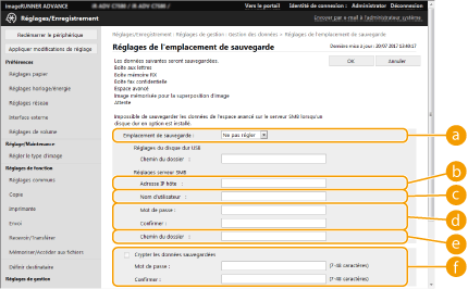 Après avoir réalisé la sauvegarde, vous pouvez cliquer sur [Journal de sauvegarde/restauration] sur l'écran affiché à l'étape 7 et vérifier les résultats de la sauvegarde dans [Résultat]. Si le message [Une erreur serveur s'est produite.] s'affiche, les réglages de réseau peuvent ne pas être correctement configurés. Vérifiez les réglages de réseau. Les données sauvegardées peuvent être restaurées non seulement sur l'appareil, mais également sur les versions ultérieures du même modèle. |