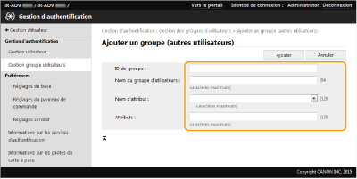 Cliquez sur [Gestion utilisateur] [Gestion d'authentification]  [Gestion groupe utilisateurs].