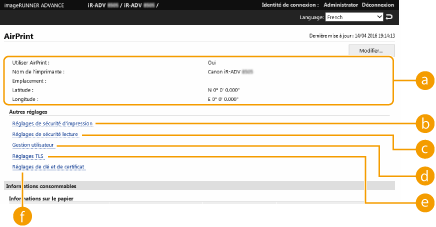Si vous vous connectez en tant qu'administrateur, vous pouvez également modifier les réglages d'AirPrint depuis la page d'AirPrint.