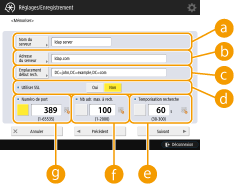 2 | Saisissez les informations nécessaires. ![]() <Nom du serveur>Saisissez le nom du serveur LDAP. <Adresse du serveur>Saisissez l'adresse IP ou le nom d'hôte du serveur LDAP en utilisant des caractères alphanumériques (Exemple : « ldap.exemple.com »). ![]() <Adresse du serveur> et DNS Pour éviter toute erreur, suivez les recommandations ci-après pour interroger le serveur LDAP depuis l'appareil afin de rechercher un destinataire. Lorsque vous saisissez l'adresse IP, assurez-vous que le serveur DNS ne prend en charge que la recherche directe. Si le serveur DNS ne prend en charge que la recherche, appuyez sur <Ne pas utiliser> ou <Utiliser>, dans <Informations d'authentif.>, à l'étape 4. Si vous sélectionnez <Utiliser(auth. sécurité)>, assurez-vous que le serveur DNS prend en charge la recherche inversée. <Emplacement début rech.>Spécifiez où commencer à chercher dans l'arborescence de répertoire du serveur LDAP. Pour LDAPv3, vous pouvez passer le réglage car la machine extrait automatoqiement le réglage du serveur. Pour LDAPv2, toujours spécifier le point. ![]() Format de saisie de <Emplacement début rech.> Si vous utilisez Windows Server, saisissez le nom de domaine de l'annuaire Active Directory sous forme de maillons de chaîne. Ajoutez "DC=" à chaque maillon, que vous séparez du suivant en remplaçant le point (".") par une virgule (","). Exemple : si le nom de domaine est "jean.exemple.fr", saisissez "DC=jean,DC=exemple,DC=fr". Si vous utilisez Lotus Notes Domino, saisissez le nom d'identification du nœud de l'arborescence d'annuaire (dn), par exemple : "cn=utilisateur1,ou=equipe1,ou=servicecommercial,o=canon". <Utiliser TLS>Pour crypter en TLS les échanges avec le serveur LDAP, appuyez sur <Oui>. <Temporisation recherche>Indiquez, en secondes, la durée maximale d'une recherche. <Nb adr. max. à rech.>Indiquez le nombre maximal de destinataires pouvant être l'objet d'une recherche. <Numéro de port>Saisissez le numéro de port utilisé dans les échanges avec le serveur LDAP. |