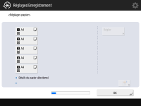 Vérifiez que le papier chargé dans le magasin ou les cassettes à papier sont correctement spécifiés. ![]() ![]() Si les formats sont corrects, appuyez sur <OK>. Pour toute information sur l'écran et les instructions pour changer les réglages, voir la section Spécification du format et du type de papier dans le magasin/la cassette à papier. S'il ne s'agit pas d'une session administrateur, passez à l'étape 11. | |