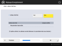 Spécifiez les réglages pour la connexion au réseau. ![]() ![]() Appuyez sur <Oui> pour <Utiliser IPv4> ou <Utiliser IPv6>, puis appuyez sur <Suivant>. Vous pouvez également utiliser IPv4 et IPv6 en même temps. Si vous appuyez sur <Non> pour <Utiliser IPv4> et <Utiliser IPv6>, et que vous appuyez sur <OK>, passez les réglages de réseau et passez à l'étape 10. ![]() Si vous appuyez sur <Oui> pour <Utiliser IPv4>, spécifiez les réglages suivants. ![]() Pour obtenir l'adresse IP automatiquement, appuyez sur <DHCP> ou <IP auto>, et appuyez sur <Suivant> ou <OK>. Pour spécifier l'adresse IP manuellement, effacez la sélection pour <DHCP> ou <IP auto>, appuyez sur <Adresse IP>, <Masque de sous-réseau>, et <Adresse de passerelle> pour saisir chaque valeur, puis appuyez sur <Suivant> ou <OK>. Pour information concernant les réglages pour les adresses IPV4, voir la section Configuration d'une adresse IPv4. ![]() Si vous appuyez sur <Oui> pour <Utiliser IPv6>, spécifiez les réglages suivants. ![]() Appuyez sur <Oui> pour utiliser l'adresse sans état ou <Non> dans le cas contraire, puis appuyez sur <Suivant>. Pour information concernant les adresses IPV6, voir la section Configuration d'une adresse IPv6. ![]() Après avoir spécifié l'adresse sans état, spécifiez les réglages suivants. ![]() Appuyez sur <Oui> pour utiliser l'adresse manuelle ou <Non> dans le cas contraire, puis appuyez sur <Suivant>. Pour utiliser l'adresse manuelle, appuyez sur <Adresse manuelle>, <Longueur préfixe> et <Adr. routeur par défaut> pour saisir chaque valeur. ![]() Après avoir spécifié l'adresse manuelle, spécifiez les réglages suivants. ![]() Appuyez sur <Oui> pour utiliser DHCPv6 ou <Non> dans le cas contraire, puis appuyez sur <OK>. | |