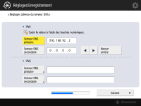 Spécifiez l'adresse du serveur DNS, le nom d'hôte et le nom de domaine DNS. ![]() ![]() Appuyez sur <Serveur DNS primaire> et <Serveur DNS secondaire>, saisissez l'adresse IPV4/IPv6 pour le serveur DNS, puis appuyez sur <Suivant>. Pour toute information sur la configuration de l'adresse d'un serveur DNS, voir la section Définition des paramètres DNS. ![]() ![]() Appuyez sur <Nom d'hôte> pour saisir le nom de l'appareil (nom d'hôte). Appuyez sur <Nom de domaine> pour saisir le nom du domaine auquel l'appareil appartient, puis appuyez sur <Suivant>. Si la configuration d'IPv4 et d'IPv6 est la même, appuyez sur <Oui> pour <Utiliser même nom d'hôte/nom de domaine que IPv4>. ![]() ![]() Pour mettre à jour automatiquement à l'aide des réglages de mise à jour de façon dynamique, appuyez sur <Oui> pour <Mise à jour dynamique DNS>, puis appuyez sur <OK>. Si vous réglez <Mise à jour dynamique DNS> pour <IPv6> sur <Oui>, sélectionnez <Oui> pour les éléments à enregistrer automatiquement. | |