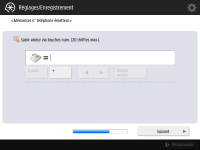 Spécifiez les réglages nécessaires pour utiliser la fonction de télécopie. ![]() Si le produit optionnel requis pour l'envoi de faxes (Options du système) n'est pas installé, passez à l'étape 11. Sélectionnez la région/le pays si l'écran de sélection s'affiche et appuyez sur <Suivant>. ![]() ![]() Saisissez le numéro de fax et appuyez sur <Suivant>. Pour toute information sur les réglages de télécopie, voir Réglages de la ligne de fax. ![]() ![]() Appuyez sur <Régler>, saisissez le nom d'utilisateur et appuyez sur <Suivant>. ![]() ![]() Sélectionnez le type de ligne et appuyez sur <OK>. | |