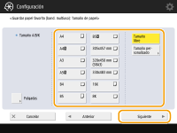 Si se establece <Especificar siempre> en <Opciones prefijadas de bandeja multiuso> a <Papel favorito>, aparecerá una pantalla desde la que podrá seleccionar su "Papel favorito" cuando vaya a cargar papel en la bandeja multiuso. <Opciones prefijadas de bandeja multiuso>