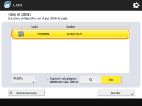 Si desea cancelar la copia en cascada, cancele la copia tanto para el equipo como para la fotocopiadora con función de cascada. Un trabajo de copia en cascada puede cancelarse desde la pantalla <Monitor de estado> de la fotocopiadora con función de cascada.