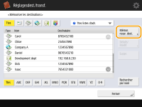 Pour enregistrer un destinataire pour votre propre usage, vous devez vous connecter avec la gestion de l'authentification personnelle. Gestion des utilisateurs La mémorisation/modification/suppression de destinations peut également être effectuée à partir des écrans suivants : <Carnet d'adresses> dans l'écran des fonctions de base du fax Opérations de base pour envoyer des fax<Carnet d'adresses> dans l’écran des fonctions de base de la numérisation Opérations de base pour numériser des documents |