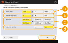 2 | Appuyez sur <Conditions du destinataire> spécifiez chaque réglage, puis appuyez sur <OK>.![]() <Format papier>Spécifiez le format de papier que le destinataire peut recevoir. Spécifiez ce réglage après avoir vérifié que le format de papier des données à envoyer correspond aux spécifications de l'appareil du destinataire. <A4/LTR> : envoie avec le format A4/LTR. <A4/LTR> + <B4> : envoie avec le format A4/LTR ou le format B4. <A4/LTR> + <A3/11x17> : envoie avec le format A4/LTR ou le format A3/11" x 17". <A4/LTR> + <B4> + <A3/11x17> : envoie avec le format A4/LTR, le format B4 ou le format A3/11" x 17". ![]() Si le format de papier des données numérisées est inférieur aux formats définis dans <Format papier>, les données sont envoyées avec le plus petit format de papier défini dans <Format papier> avec des marges vides. Si le format de papier des données numérisées est supérieur aux formats définis dans <Format papier>, les données sont réduites et envoyées avec le plus grand format de papier défini dans <Format papier>. Définissez les conditions de destination en fonction des spécifications de l'appareil du destinataire. Si le format de papier des données à envoyer est supérieur aux formats de données qui peuvent être utilisés avec l'appareil du destinataire, l'image peut être coupée ou tronquée. <Méthode compression>Sélectionnez la méthode de compression. Le taux de compression augmente dans l'ordre suivant : MH, MR et MMR. Plus le taux de compression est élevé, plus le temps de transmission requis est court. <Résolution>Sélectionnez une valeur plus élevée pour augmenter la résolution et la qualité d'image. Notez cependant que plus la résolution est élevée, plus le temps de transmission requis est long. <Fragmenter données>Si la taille des données à transmettre dépasse la limite maximale (<Taille données max. pour l'envoi>), sélectionnez si voulez diviser les données par taille ou par page. Si vous sélectionnez <Oui>, les données sont divisées en tailles plus petites ne dépassant pas la limite et sont envoyées en plusieurs parties. L'appareil du destinataire doit pouvoir combiner les données reçues. Si vous sélectionnez <Non> dans <Envoyer via le serveur> ( ) à l'étape 1 pour configurer le réglage pour les I-fax, les données sont envoyées sans être divisées, même si elles dépassent la limite maximale.![]() Réglez les conditions de destinataire selon les spécifications de l'appareil du destinataire. Si les conditions réglées ne sont pas prises en charge par cet appareil, une erreur de transmission peut se produire. |