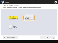 Ajustement des formats de code TLVous pouvez ajuster les paramètres de code TL comme la taille à l'écran à l'étape 5. Lorsque vous ne pouvez pas numériser correctement les informations intégrées, ajustez ces paramètres. Selon l'appareil utilisé, les informations intégrées peuvent ne pas être numérisées correctement, même après l'ajustement du code TL. En outre, il est possible qu'elles ne soient pas numérisées correctement quand la totalité de la surface de l'original est une photographie. Traitement d'un document numérisé avec des informations intégrées différentesLors de la copie de documents pour lesquels <Auth. mot de passe> ou <Authentification utilisateur> est défini, les informations intégrées sur la première page sont utilisées pour l'authentification. Dans le cas suivant, la tâche sera annulée : lorsque les informations intégrées sur la première page diffèrent des informations intégrées sur la deuxième page et les suivantes (par ex., lors de la copie d'un document avec le mot de passe « 1234567 » intégré sur la première page et le mot de passe « 9876543 » intégré sur la deuxième page). |