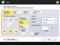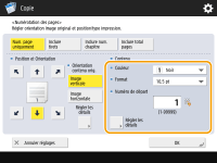 Les numéros et les symboles ne sont pas imprimés sur les couvertures (Ajout d'une couverture et d'un verso) ou les feuilles insérées (Insertion de feuilles et de pages de chapitre (feuilles insérées)). Les numéros de jeux de copies sont imprimés sur toutes les pages copiées. Les numéros de jeux de copies peuvent être imprimés avec des dates ou du texte. <Réglages d'impression> <Régl. options numérot. jeux de copies>Le texte pour la <Numérotation des pages> et le <Filigrane> peut également être sélectionné à partir du texte qui a été enregistré dans <Enreg. caractères pour Num. pgs/Filigrane>. Si vous sélectionnez deux options parmi <Numérotation des pages>, <Filigrane>, <Date d'impression> et <Numérotation jeux copies> pour imprimer dans la même position, un message vous demandant si vous voulez imprimer avec ces réglages s'affiche lorsque vous appuyez sur (Start).Si vous sélectionnez <Inclure num. chapitre> en combinaison avec <Intercalaires>, les numéros de chapitre sont comptés aux occurrences suivantes : Après l'insertion de chaque page de chapitre Après l'insertion de chaque insertion de feuille Si vous définissez <Régl. options numérot. jeux de copies> sur <Oui>, les réglages que vous pouvez modifier changent comme suit. <Régl. options numérot. jeux de copies> Vous ne pouvez plus sélectionner <Toute la surface> et <Numéros à 5 endroits> comme positions d'impression dans le mode Numérotation des jeux de copies. Les tailles de numéro du mode Numérotation des jeux de copies deviennent <10,5 pt>, <12,0 pt> et <14,0 pt>. |