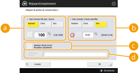 Vous ne pouvez pas configurer les paramètrages pour le rapport de gestion de communication quand <Afficher le journal des tâches> dans <Réglages de gestion> est défini sur <Non>. En outre, si vous modifiez <Afficher le journal des tâches> en <Réglages de gestion> de <Non> en <Oui>, <Impr./envoyer Nb spéc. transm.> et <Impr./envoyer à heure spécifiée> dans le rapport le gestion de communication change en <Non>. |
