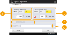 Vous ne pouvez pas configurer les paramètrages pour le rapport d'activité de fax quand <Afficher le journal des tâches> dans <Réglages de gestion> est défini sur <Non>. En outre, si vous modifiez <Afficher le journal des tâches> en <Réglages de gestion> de <Non> en <Oui>, <Impr./envoyer Nb spéc. transm.> et <Impr./envoyer à heure spécifiée> dans le rapport d'activité de fax change automatiquement en <Non>. |
