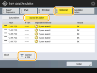 (Suivi statut), l'écran Suivi statut/Annulation s'affiche, vous permettant de vérifier l'historique des utilisations de chaque fonction comme la copie, l'impression, l'envoi d'e-mails, l'envoi/la réception de fax/I-fax, le stockage de fichiers dans l'Boîte avancée, etc. À partir de cet écran, vous pouvez aussi imprimer l'historique des utilisations de chaque fonction.![]() |