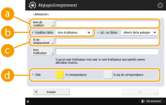 <Act. sur tâches>Sélectionnez le mode de gestion des documents qui répondent aux conditions. Si <Attente tâche partagée> est sélectionné, vous pouvez définir <ID de remplacement> pour spécifier le nom d'utilisateur généré au journal lors de l'impression. Sélectionnez <Annuler> pour éliminer le document. <Cible>Vous pouvez définir une valeur spécifiée par l'opération cible ou une valeur non spécifiée. | ||||||