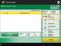 Pour vérifier le nombre total de destinataires spécifiésLe nombre total de destinataires spécifiés est affiché en haut à droite de l'écran. Cela vous permet de vérifier que le nombre de destinataires est correct avant de faire l'envoi. Annulation immédiate d'une tâche en cours d'envoiSi vous appuyez sur  (Stop) sur le panneau de commande pendant l'envoi d'une tâche, le message <Annuler la tâche d'envoi suivante ?> s'affiche. Appuyez sur <Oui> pour annuler l'envoi. Lorsqu'il y a plusieurs tâches d'envoi, appuyez sur  (Stop) pour afficher l'écran afin de sélectionner la tâche d'envoi à annuler. Si la tâche d'envoi que vous voulez annuler n'est pas affichée, appuyez sur <Vérifier autres tâches> pour afficher <Envoyer les tâches>. Sélectionnez la tâche que vous voulez annuler, et appuyez sur <Annuler>. Pour vérifier les statuts pour les documents envoyés/sauvegardésDans l'écran <Suivi statut>, vous pouvez vérifier les statuts pour les documents envoyés/sauvegardés. Cet écran vous permet d'envoyer/sauvegarder de nouveau des documents ou d'annuler l'envoi/sauvegarde après avoir vérifié les statuts. Vérification du statut et journal des documents scannésLorsque <Afficher notification à l'acceptation de la tâche> est réglé sur <Oui>, l'écran <Suivi statut> peut s'afficher à partir de l'écran suivant qui apparaît après la réception d'une tâche. <Afficher notification à l'acceptation de la tâche>Pour imprimer le rapport pour les résultats de l'envoi/sauvegardeSur l'écran des fonctions de base de la fonction Fax, vous pouvez appuyer sur <Options>  <Rapport TX> pour pouvoir configurer l'impression automatique du rapport listant les résultats de l'envoi/l'enregistrement. Pour définir cette option pour chaque tâche à partir des <Options>, il est nécessaire de sélectionner <Erreur seulement> ou <Non> dans <Rapport TX>, puis de définir <Autoriser impression dans Options> sur <Oui>. Nom de fichierLorsqu'un fichier est envoyé/enregistré, son nom de fichier est automatiquement défini sur la base du format suivant. Vous pouvez changer le réglage pour qu'un nom de fichier différent soit attribué. Définir un nom du fichierPour envoyer par e-mail Format "Numéros de tâche (quatre chiffres)_numéros de pages (trois chiffres).nom d'extension de fichier", par exemple "1042_001.jpg" Pour enregistrer dans un serveur de fichiers Format "Année, mois, jour, heure, minute et seconde d'enregistrement du fichier (14 chiffres).nom d'extension de fichier", par exemple "20151030133541.jpg" Sujet du courrielDétecter chrgr/alim. multiple Détecter chrgr/alim. multiple Si plusieurs feuilles sont alimentées en même tempsLa numérisation s'arrête et le message s'affiche à l'écran. Suivez les instructions pour éliminer le bourrage papier. Une fois le bourrage éliminé, l'écran de reprise du travail s'affiche. Si l'appareil détecte par erreur le chargement de plusieurs feuilles, appuyez sur <Ne pas détecter chargeur/alim. multi> pour recommencer la numérisation. Pour configurer l'appareil à l'avance de sorte qu'il ne signale pas le chargement de plusieurs feuilles, effectuez une des opérations suivantes. A chaque envoi/enregistrement d'un document, appuyez sur <Options> sur l'écran des fonctions de base de numérisation  sélectionnez <Détecter chrgr/alim. multiple> pour désactiver le réglage. |
