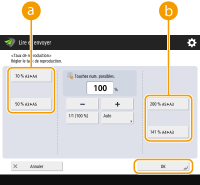 Si vous définissez le mode couleur sur <Auto (Coul./Gris)>, <Auto (Couleur/N&B)>, <Quadrichromie> ou <Niveaux de gris>, vous pouvez uniquement envoyer des documents avec un taux de reproduction (zoom) de 100 %. Toutefois, si des adresses I-fax uniquement sont définies comme destinations, vous pouvez modifier le taux de reproduction quel que soit le mode couleur.