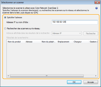 [Color Network ScanGear 2 Tool].1 | Cliquez sur [Spécifier l'adresse] et saisissez l'adresse IP ou le nom d'hôte de l'appareil dans la zone de texte[Adresse IP ou nom d'hôte]. |