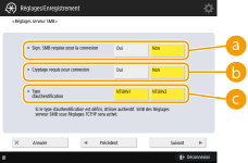 1 | Sélectionnez le type d'authentification. <Sign. SMB requise pour la connexion>Pour demande une signature des paquets SMB lors de la connexion à un serveur SMB, appuyez sur <Oui>. <Cryptage requis pour connexion>Pour demander une connexion avec une communication cryptée SMB v3.0 lors de la connexion à un serveur SMB, appuyez sur <Oui>. <Type d'authentification>Si vous spécifiez le type d'authentification, l'option <Utiliser authentif. SMB> dans <Réglages serveur SMB> est réglée sur <Oui>. <Réglages TCP/IP> <Réglages serveur SMB> |