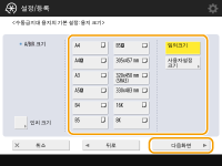 1 | <사용자설정 크기>을 누릅니다. ![]() 용지 크기를 <임의크기>로 설정할 수 있으며 용지 크기 설정을 입력할 필요가 없어집니다. 복사에 사용하기 위해 알려지지 않은 크기의 용지를 넣거나 용지 크기가 이미 프린터 드라이버에 등록되어 있는 경우 <임의크기>를 지정합니다. |