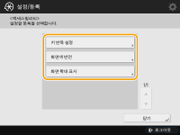 기기가 시작될 때 표시되는 화면을 설정합니다.기기가 시작될 때 사용자가 로그인을 하도록 구성된다면( 로그인 화면 표시 시점 지정하기), <기동/복구후 표시화면>은 <개인 설정>의 항목으로 표시됩니다. 기기가 시작된 후 표시되는 화면은 각 사용자를 위해 설정될 수 있습니다. |