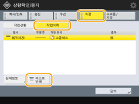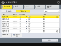 (상황확인)을 누르면 상태 모니터/최소 화면이 표시되어 복사, 인쇄, 이메일 전송, 팩스/I-팩스 전송/수신, "고급 박스"에 파일 저장 등의 각 기능에 대한 사용 기록을 확인할 수 있습니다. 또한 이 화면에서 각 기능에 대한 사용 기록을 인쇄할 수 있습니다.![]() |