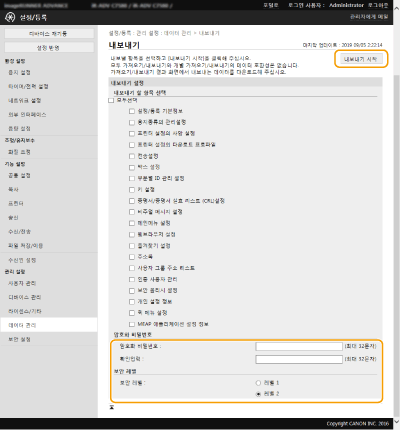 기기에서 설정 데이터 전체를 내보내어 이를 컴퓨터에 저장할 수 있으며, 교체 기기를 구입하는 경우 처럼, 새 기기에 설정 구성 시 이 데이터를 불러오기할 수 있습니다. 두 대 이상의 Canon 다기능 프린터*에 동일한 설정을 구성하려면, 전체 설정을 한 기기에서 내보내기 한 후에 다른 기기로 모두 가져오기하여, 각각의 기기를 별도로 설정하지 않아도 됩니다. 이 작업을 실행하려면, 관리자 권한으로 리모트 UI에 로그인하십시오.