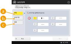 4 | <메모리 수신 시작시각>을 누르고 필요한 설정을 지정합니다. ![]() <매일>메모리 수신을 시작하는 시간을 설정합니다. <요일지정>메모리 수신이 시작되는 요일과 시간을 설정합니다. <해제>메모리 수신 시작 시간을 설정하고 싶지 않을 때 선택합니다.
