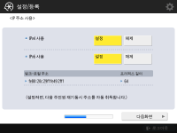 네트워크 연결 설정을 지정합니다. ![]() ![]() <IPv4 사용> 혹은 <IPv6 사용>를 위해 <설정>를 누른 후 <다음화면>를 누릅니다. IPv4와 IPv6을 모두 사용할 수 있습니다. <IPv4 사용> 및 <IPv6 사용>을<해제> 으로 누르고, <확인>를 누를 경우, 네트워크 설정을 건너뛰고 10단계로 갑니다. ![]() <IPv4 사용>를 위해 <설정>누르는 경우 다음 설정을 지정하십시오. ![]() IP 주소를 자동으로 획득하려면, <DHCP> 혹은 <자동 IP>를 누른 후 <다음화면> 또는 <확인>를 누르십시오. IP 주소를 수동으로 설정하려면 <DHCP> 또는 <자동 IP>에 대한 선택을 해제하고, <IP주소>, <서브넷 마스크> 및 <게이트웨이 주소>를 눌러 각 값을 입력한 후 <다음화면> 또는 <확인>을 누릅니다. IPV4 주소 설정에 대한 정보는 IPv4 주소 설정을 참조하십시오. ![]() <IPv6 사용>를 위해 <설정>누르는 경우 다음 설정을 지정하십시오. ![]() 스테이트리스 주소를 사용하려면 <설정>를 누르거나 스테이트리스 주소를 사용하지 않으려면 <해제>를 누른 후, <다음화면>를 누릅니다. IPv6 주소에 대한 정보는 IPv6 주소 설정를 참조하십시오. ![]() 스테이트리스 주소를 지정한 후 다음 설정을 지정합니다. ![]() 수동 주소를 사용하려면 <설정>를 누르거나 수동 주소를 사용하지 않으려면 <해제>를 누른 후, <다음화면>를 누릅니다. 수동 주소를 사용하려면 <수동 주소>, <프리픽스 길이>를 누른 뒤 <기본 라우터 주소>를 눌러 각 값을 입력합니다. ![]() 수동 주소를 지정한 후 다음 설정을 지정합니다. ![]() DHCPv6를 사용하려면 <설정>를 누르거나 DHCPv6를 사용하지 않으려면 <해제>를 누른 후, <확인>를 누릅니다. | |