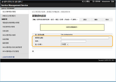 1 | 按一下 [MEAP應用程式管理] 按一下應用程式以設定認證資訊。 |