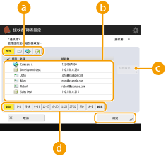 1 | 選擇要在群組中註冊的接收者,然後按 <確定>。 ![]() 接收者類型按鈕選擇 (電子郵件)、 (傳真)、 (I-fax) 或 (檔案)篩選通訊清單 ( ) 中顯示的接收者。按 <全部> 顯示所有註冊的接收者。 接收者您於步驟 6 中選擇的通訊清單內註冊的接收者將顯示。從此清單中,選擇要在群組中註冊的接收者。 ![]() 使用存取號碼管理接收者時,除非您輸入存取號碼 (限制對在通訊錄註冊之接收者的存取),否則這些接收者不會在按 <存取號> 後於清單中顯示。 <詳細資訊/編輯>如果要檢查接收者的設定,請選擇接收者,然後按 <詳細資訊/編輯>。按 <確定> 返回上一畫面。 首個字母按鈕選擇接收者名稱第一個字元的英數按鈕。按 <全部> 以顯示所有註冊的接收者。 |
