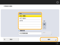 會出現在觸控面板顯示幕的底部。您可按下 <切換語言/鍵盤> 按鈕、從清單選擇所需的語言,然後按下 <確定>,將目前顯示的語言切換成其他語言。