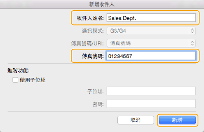在 [收件人姓名] 中輸入接收者名稱,在 [傳真號碼] 中輸入傳真號碼,然後按一下 [新增] [取消]。