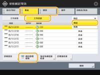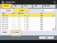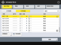 如果列印清單的「結果」欄顯示「NG」,請查看「#」開頭的三位數字,以找出原因和解決方法。 如果 (設定/註冊) <管理設定> <裝置管理> <限制存取其他使用者的工作> 設為 <開啟>,非登入使用者的工作會顯示為「***」且無法執行。如果以管理員權限登入,將顯示所有使用者的工作。 |