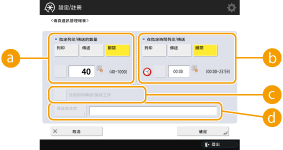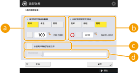 <管理設定> 的 <顯示工作日誌> 設為 <關閉> 時,無法指定通訊管理報表的設定。此外,如果在 <管理設定> 中將 <顯示工作日誌> 從 <關閉> 變更為 <開啟>,則通訊管理報表中的 <指定列印/傳送的數量>和 <在指定時間列印/傳送> 會自動變更為 <關閉>。 |
