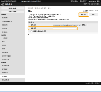 將部門 ID 管理設定匯入已經啟用部門 ID 管理的不同多功能印表機時,將會覆寫系統管理員資訊,如此可能會使得您無法使用先前的系統管理員 ID 與 PIN 登入。在執行此作業之前,請務必查看儲存於匯出機器中的系統管理員資訊。