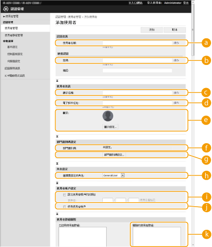 dc | 否 | 0 至 32 個字元 | 控制字元 | - (N/A) | 無法變更。為下列使用者自動指派。 按照伺服器認證註冊的使用者 透過圖片登入中的 <工作接收時自動註冊> 註冊的使用者 |