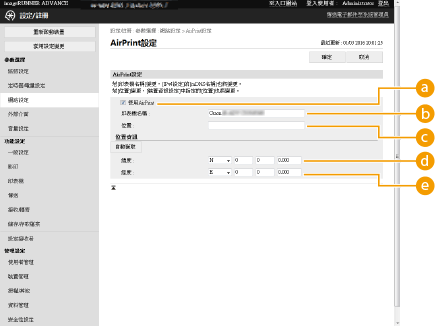 您可以註冊用來識別本機的資訊,包括本機名稱和安裝位置。使用 AirPrint 所需的設定可透過遠端使用者介面從遠端指定。