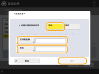 使用 Proxy 伺服器的認證功能時,按下此按鍵設定認證資訊。在顯示的畫面上按下 <開啟>,並輸入 Proxy 認證的使用者名稱和密碼,然後按 <確定>。