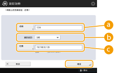 2 | 輸入必要的資訊,並且按 <確定>。 ![]() <名稱>輸入要連接的進階郵件信箱的名稱。由於在此輸入的名稱將在存取時出現於清單上,因此請輸入易於辨識的名稱。 <通訊協定>視是否提供 Windows 伺服器或接收者的進階郵件信箱做為 SMB 伺服器或 WebDAV 而定,選擇 <SMB> 或 <WebDAV>。 <位置>/<主機名稱>您選擇 <SMB> 時,將顯示 <位置>,您在通訊協定設定中選擇 <WebDAV> 時,將顯示 <主機名稱>。 在 <位置> 中輸入位址「\\(主機名稱或 IP 位址)\share」連線到共用空間,或輸入位址「\\(主機名稱或 IP 位址)\users」連線到個人空間。 在 <主機名稱> 中輸入位址「https://(主機名稱或 IP 位址)」,並且按 <下一步>。然後,在 <資料夾路徑> 中,對於共用空間輸入「/share」或對於個人空間輸入「/users」。 ![]() 除了對外公開的其他 imageRUNNER ADVANCE 系列機器的進階郵件信箱或 Windows 伺服器,請勿註冊其他項目,因為這樣做可能會導致本機運作不正常。 |