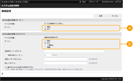 同期の通信ログを確認するカスタム設定の同期画面から、通信ログを確認することができます。ログはファイルとしてダウンロードすることもできます。 サーバー機が一時的に通信できない場合などはレベルに「Warning」が記録されます。 登録データの上限を超えている場合や、サーバー機との認証に失敗した場合にはレベルに「Error」が記録されます。 かんたんに同期設定をする同一ルーター内に存在するキヤノン複合機の場合は、カスタム設定の同期を操作パネルから開始することができます。 サーバー機の場合: (設定/登録) <管理設定> <デバイス管理> <カスタム設定の同期 (サーバー)>を<開始>クライアント機の場合: (設定/登録) <管理設定> <デバイス管理> <カスタム設定の同期 (クライアント)>を<開始>サーバー機兼クライアント機として動作させる場合はサーバー機の<カスタム設定の同期 (クライアント)>も<開始>にします。 認証方式として<User Authentication>が有効になっている必要があります。 同期を終了する場合のご注意クライアント機がカスタム設定の同期を終了した場合、サーバー機に登録されている各ユーザーの設定値を取得できなくなります。そのため、カスタム設定の同期を終了後にクライアント機であったデバイスのパーソナライズデータは最新の状態でない可能性がありますのでご注意ください。 |