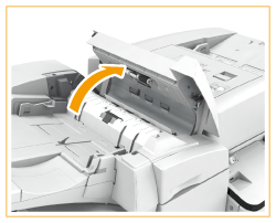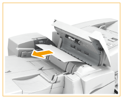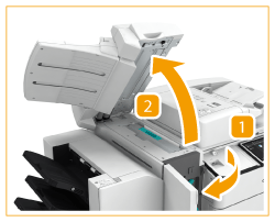 「ペーパーフォールディングインサーターユニット・J」のインサーター部は、フィニッシャーの紙づまり処理をするときに部位が干渉することがあります。フィニッシャーの紙づまり処理をする前に、あらかじめインサーター部を開けてください。
