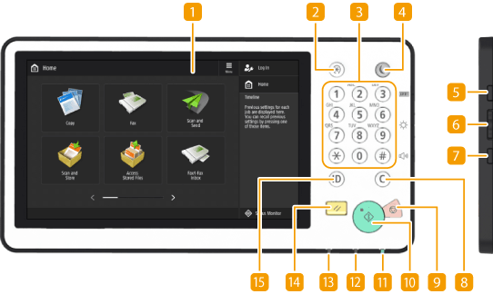 Press to check the status of printing or faxing, or to view the usage history. You can also check the status of the machine, such as the remaining amount of paper and toner, or whether any errors occurred.