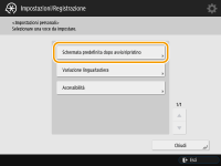 Impostazione della schermata visualizzata quando la macchina si avviaSe la macchina viene configurata in modo che gli utenti debbano effettuare l'accesso quando si avvia ( Configurazione del momento di visualizzazione della schermata di accesso), appare <Schermata predefinita dopo avvio/ripristino> come voce in <Impostazioni personali>. Per ciascun utente è possibile impostare la schermata visualizzata dopo l'avvio della macchina. |
