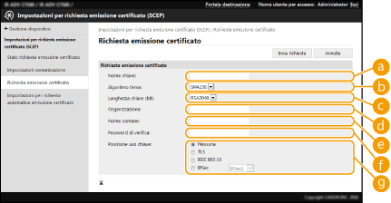 È possibile inviare una richiesta di emissione del certificato richiesto per le chiavi generate con la macchina a un server SCEP (Simple Certificate Enrollment Protocol), che gestisce i certificati. I certificati emessi dal server SCEP vengono automaticamente registrati sulla macchina. Per inviare una richiesta di emissione di un certificato sono necessari i privilegi di Administrator.