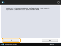 Registrazione da un dispositivo mobile o da Google ChromeÈ possibile registrare la macchina da un dispositivo mobile o da Google Chrome. Prima che la registrazione venga completata, sul display della macchina viene visualizzata la schermata di conferma seguente. Premere <Sì> per completare la registrazione. Per informazioni sui metodi di registrazione, consultare il manuale del dispositivo o la home page di Google Cloud Print. |