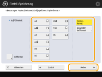1 | Drücken Sie <Anwenderdef.Format>. ![]() Sie können das Papierformat als <Sonderformat> angeben, sodass Sie die Einstellung für das Papierformat nicht eingeben müssen. Legen Sie <Sonderformat> fest, wenn Sie Papier eines unbekannten Formats zum Kopieren einlegen oder wenn das Papierformat bereits im Druckertreiber gespeichert ist. |