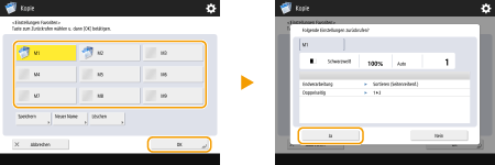 Drücken Sie <Kopie>, und legen Sie die Einstellung fest, die Sie speichern möchten.