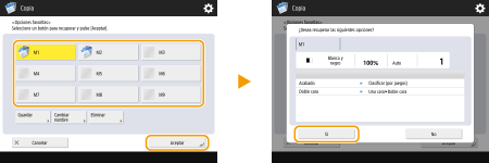 <La información especificada para el nuevo destino de archivopuede incluir una contraseña. ¿Desea incluir la contraseña al guardar? (Pulse [No] para guardar el destino sin la contraseña.)> Si los mensajes anteriores se muestran al registrar <Opciones favoritas> para <Leer y enviar>, realice las siguientes operaciones. Si desea recuperar los ajustes favoritos sin introducir una contraseña, pulse <Sí> para conservar la información de la contraseña. Si desea recuperar los ajustes favoritos al introducir una contraseña, pulse <No> para eliminar la información de la contraseña. (Si importa a menudo ajustes favoritos a otros dispositivos, puede hacer que se requiera la introducción de una contraseña cada vez para evitar que los usuarios se hagan pasar por otros.) |