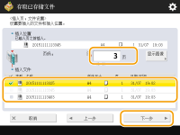 2 | 指定要插入的文件以及插入文件的位置,然后按<下一步>。 ![]() 使用数字键输入要插入文件的页码。 |