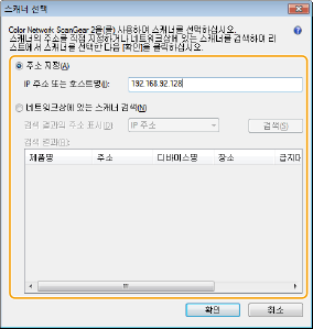 [Color Network ScanGear 2 Tool]을 클릭하십시오.1 | [주소 지정]를 클릭하고 [IP 주소 또는 호스트명] 텍스트 상자에 기기의 IP 주소 또는 호스트 이름을 입력합니다. |